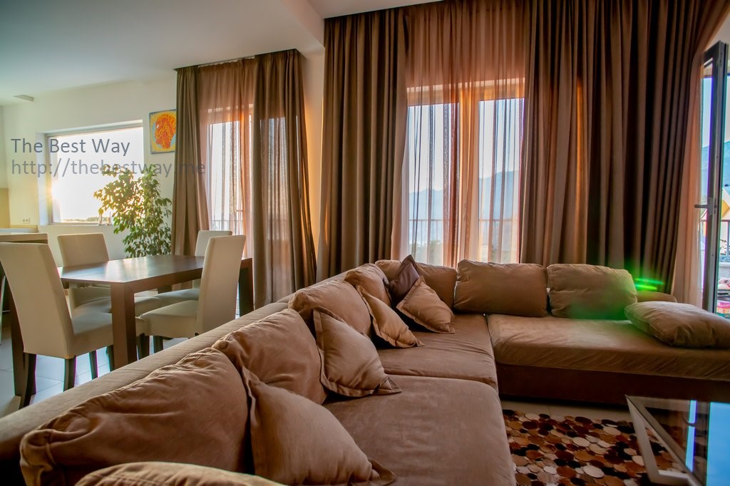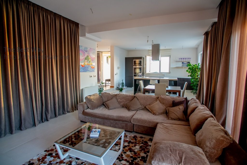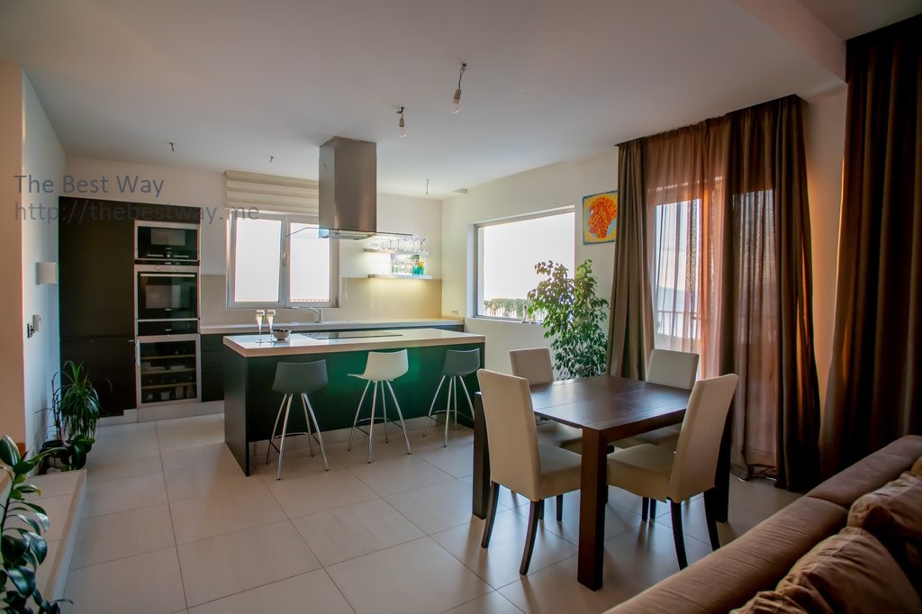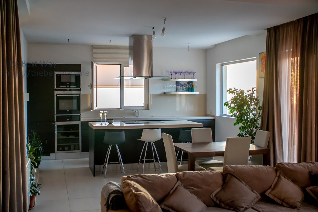 На Первом этаже находится просторная кухня, оборудованная бытовой техникой Simens, винным холодильником, мебелью из высококачественных материалов из натурального дерева, а также кухонной столешницей и островом из натурального камня. Здесь же находится уютная гостиная и столовая.