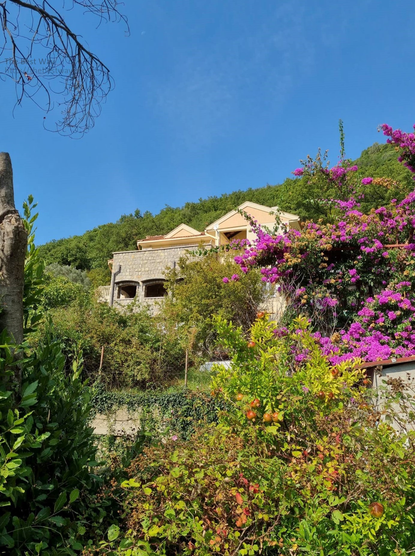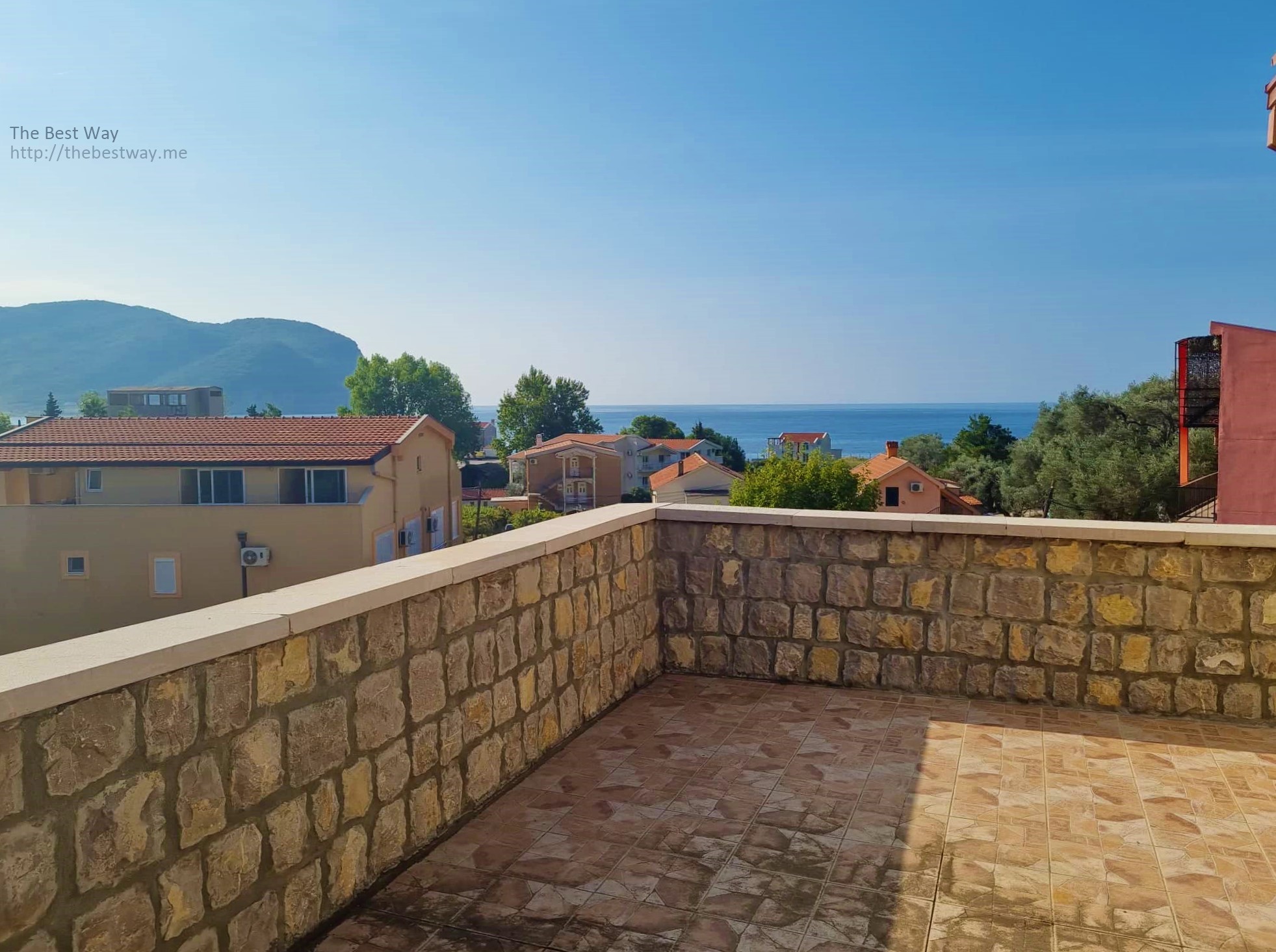Dvorište je terasasto, popločano kamenom, sa roštiljem, garažom. Kuća ima dvije etaže stambenih prostora i svaka etaža ima poseban ulaz. - U suterenu se nalaze: soba, toalet, vešeraj. - Prvi sprat se sastoji od: dnevnog boravka sa kaminom, 4 spavaće sobe, kuhinje, kupatila i velike terase sa panoramskim pogledom na planine i more.. - Drugi sprat se sastoji od: dnevnog boravka, 3 spavaće sobe, čajne kuhinje, kupatila i velike terase sa panoramskim pogledom na more i planine.