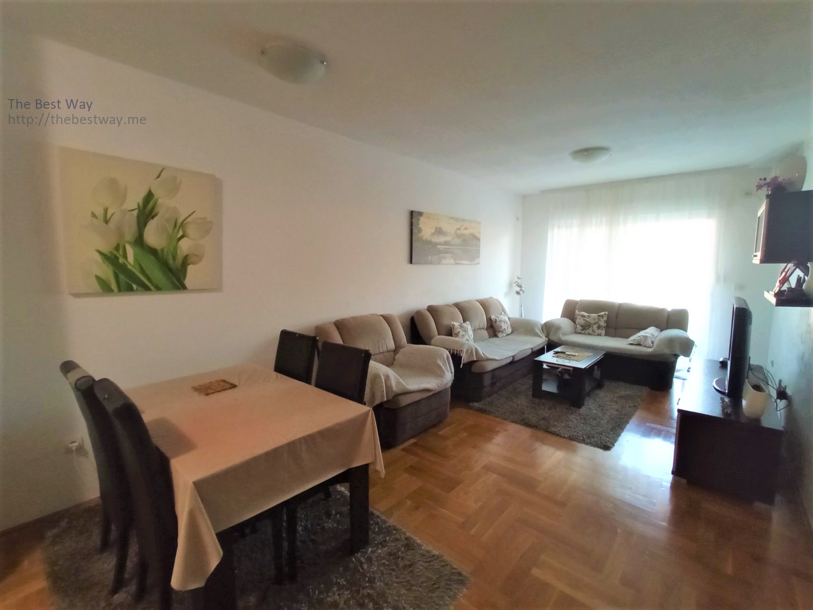 Stan se po strukturi sastoji od ulaznog hodnika, prostranog dnevnog boravka u kombinaciji sa trpezarijom i kuhinjom, dve spavaće sobe, kupatila, dve terase sa pogledom na grad i planine. Stan je kompletno namješten. Opremljen svom potrebnom opremom. Apartman se nalazi 950 metara od mora i rive. Perspektivno područje, razvijena infrastruktura.