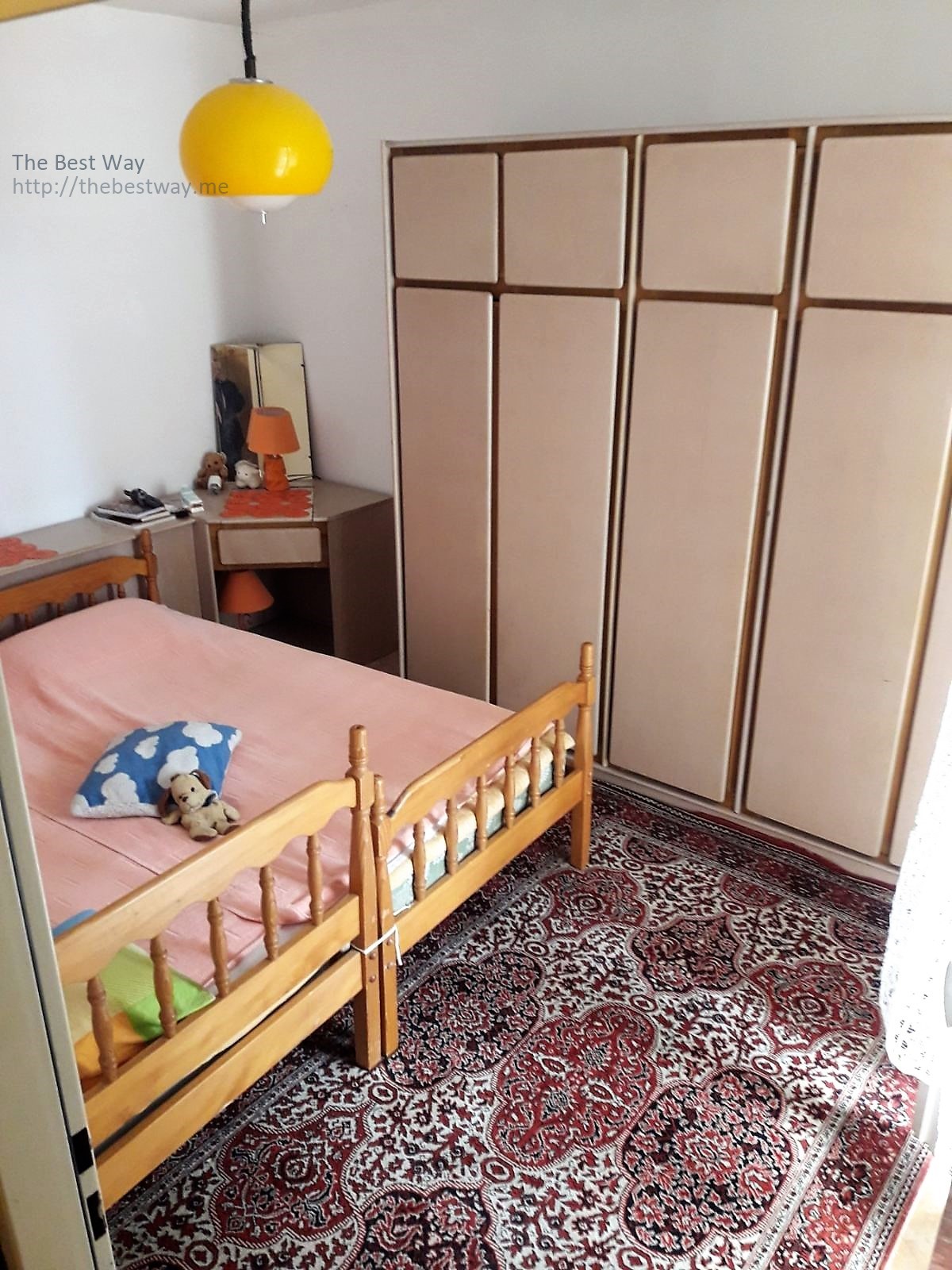 Površina 69 kvadratnih metara + 2 terase 2. sprat u zgradi od 4 sprata. Raspored: 3 sobe (dvije spavaće sobe i dnevni boravak), 2 toaleta (kupatilo i wc), kuhinja i blagovaonica. Dva hodnika koji razdvajaju spavaću sobu i dnevni boravak. Jedna mala terasa ima izlaz na spavaću sobu, a velika terasa u dnevni boravak i ima izlaz u trpezariju. Podrum i parking ispred zgrade. Udaljenost do mora: 900 metara