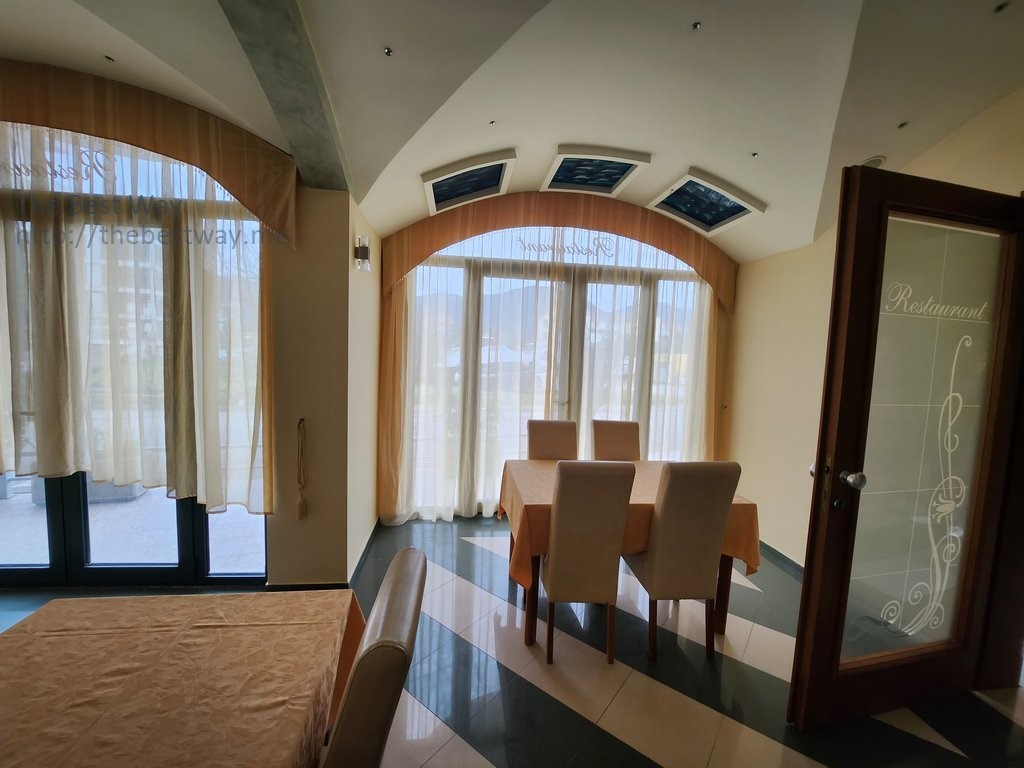 Продается отель на второй линии, 100 метров до моря. В здании 4 этажа, на первом находится рецепция, кафе в отдельном помещении и ресторан с летней террасой. На втором и третьем этаже находится 16 комнат, по 8 на каждом этаже, планировка идентичная. На последнем этаже три просторных апартамента с большими террасами. Потрясающий вид на море и на горы. Есть сигнализация. Отель не принимал постояльцев с 2020 года, однако внутренняя отделка в очень хорошем состоянии, нет следов влаги или плесени.