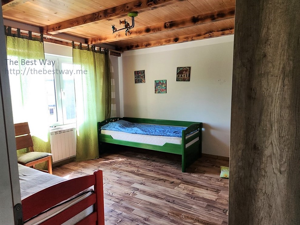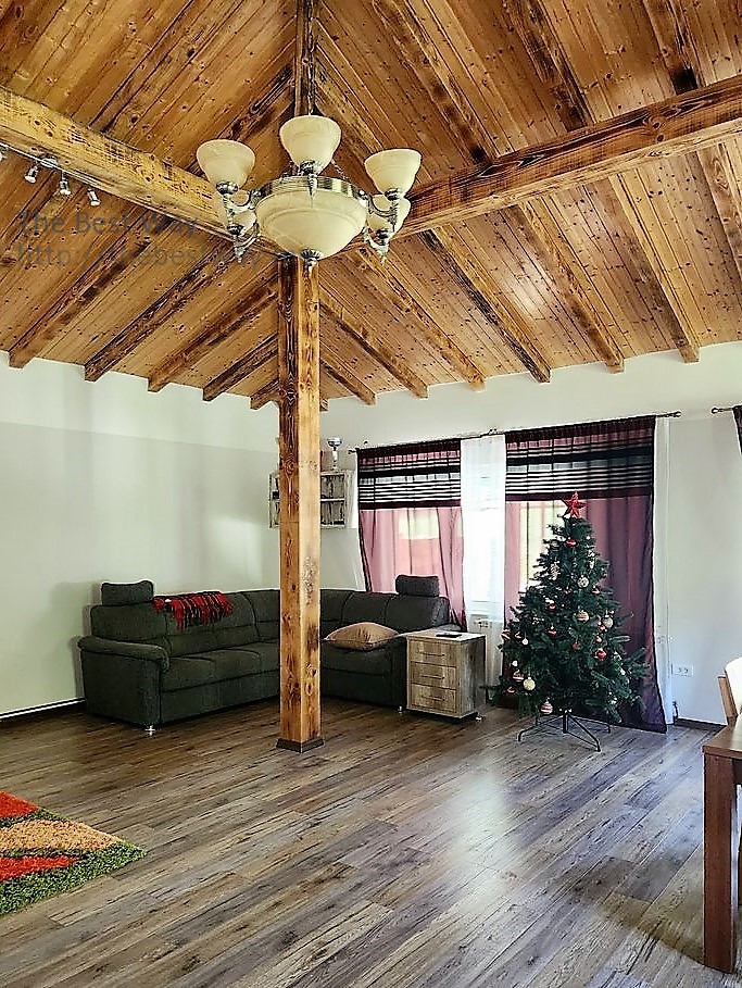 On the second floor there is a living space. Three bedrooms, bathroom, large living room with kitchen, fireplace and high ceiling with wooden supporting columns.