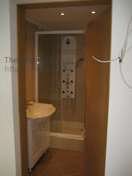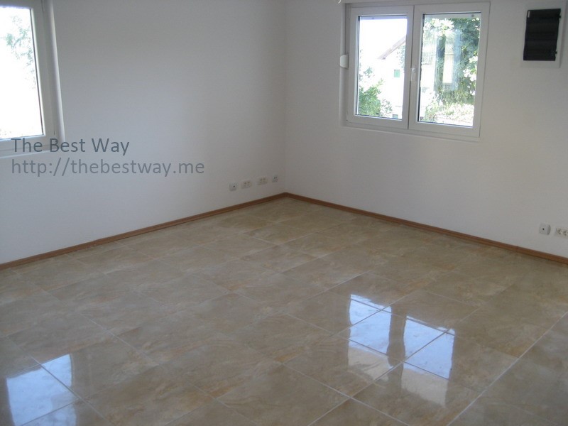 Апартаменты на первом этаже имеют гараж, терассу, покрытую натуральным камнем, небольшую лужайку с газоном, один большой балкон. Внутри расположены кухня и холл общей площадью 27 м2, спальни 16 и 12 м2, сан.узел 4.7 м2.