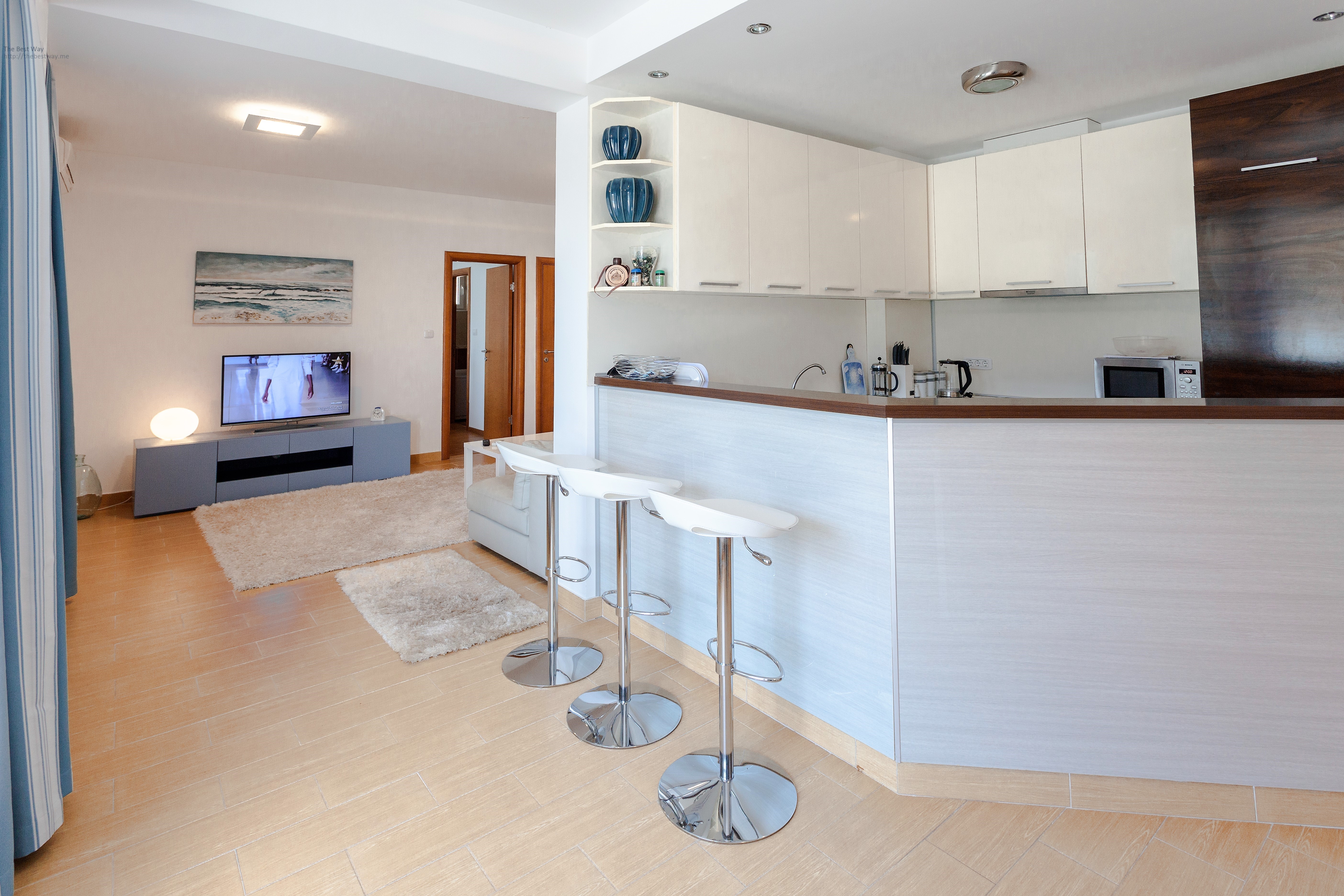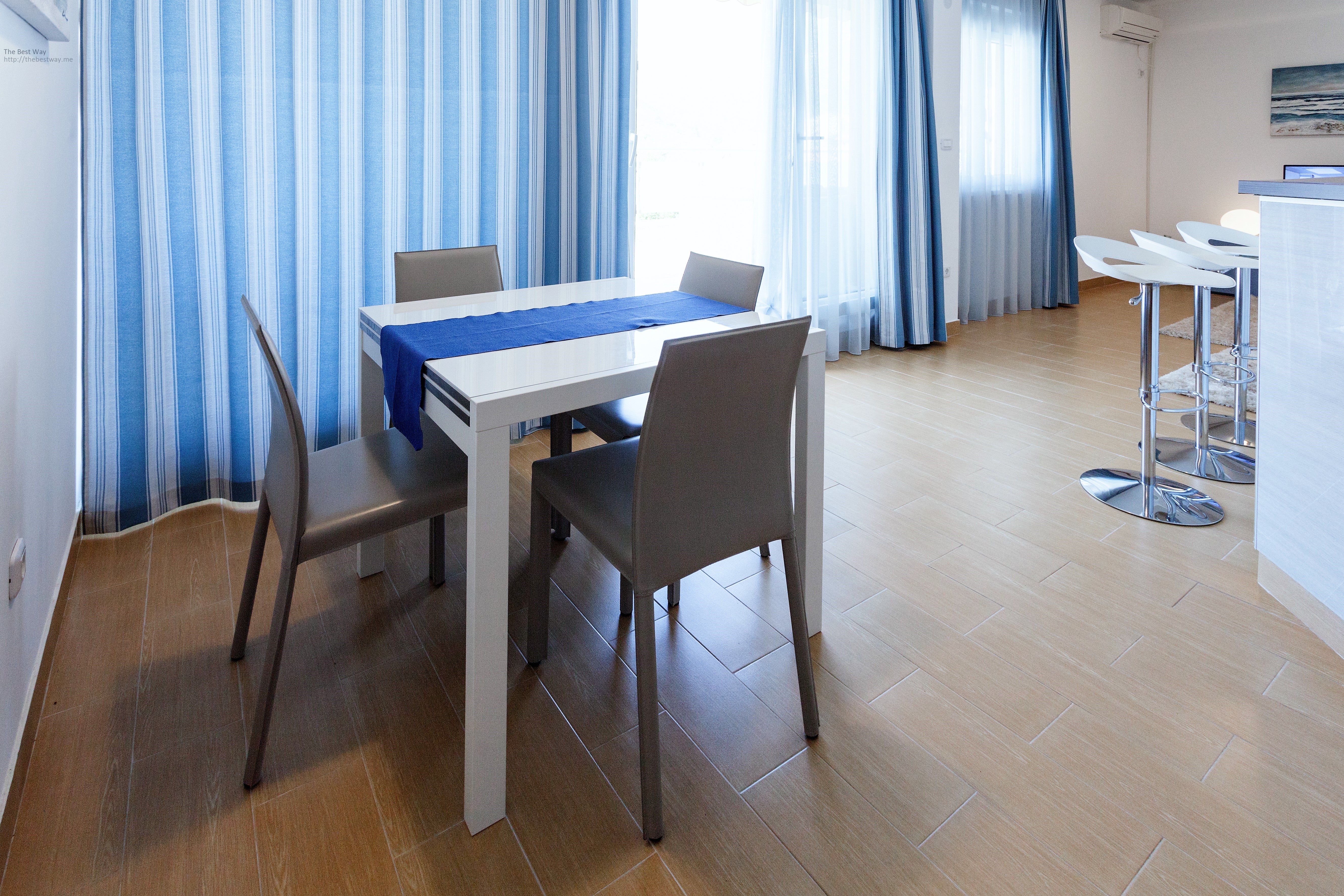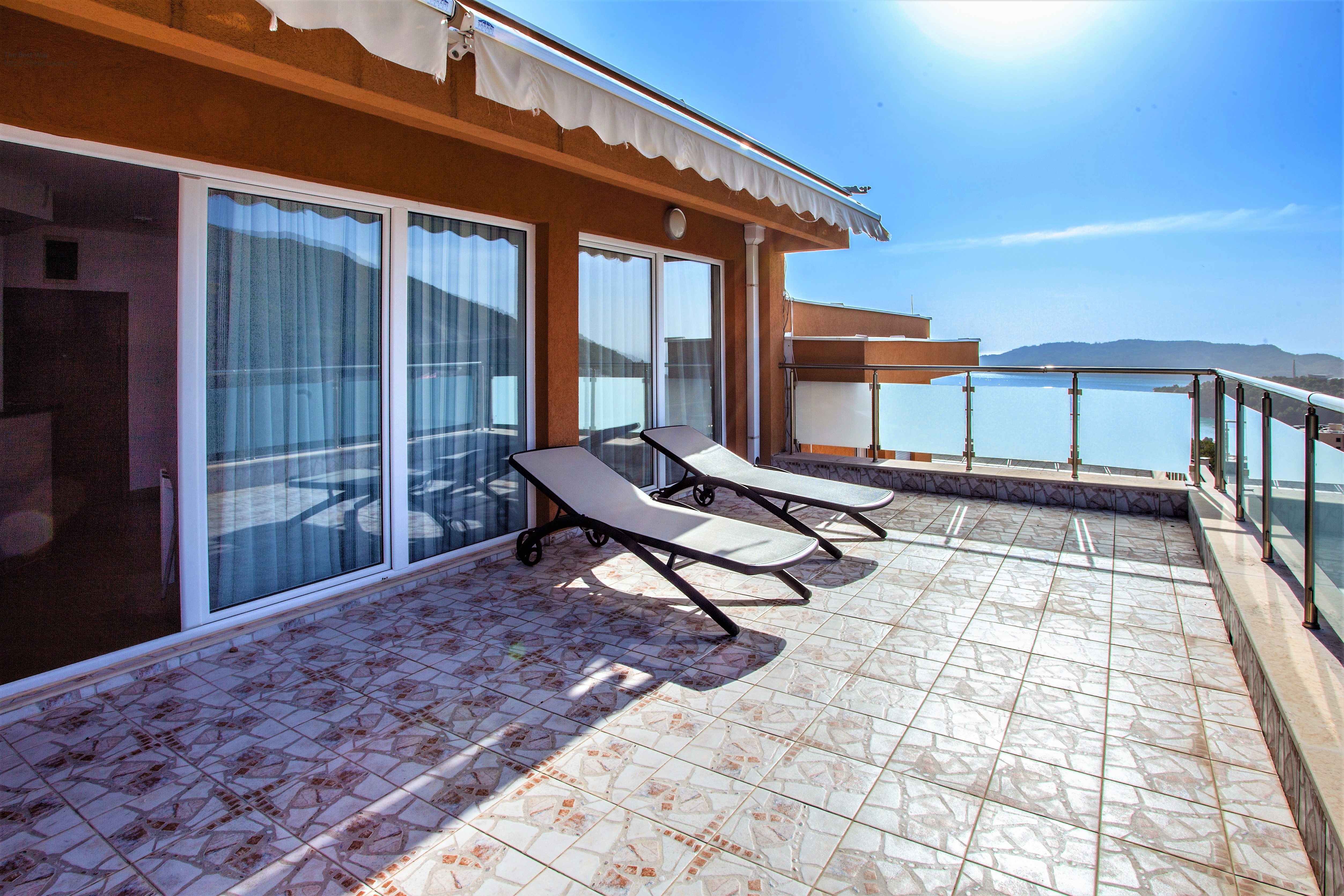 Квартира оборудована стильной итальянской мебелью и всей необходимой бытовой техникой, а на террасе смонтирована винтовая лестница для индивидуального использования крыши. Панорамный вид на горы и море о. Св. Никола.