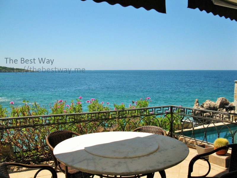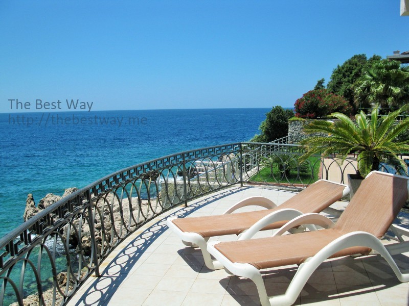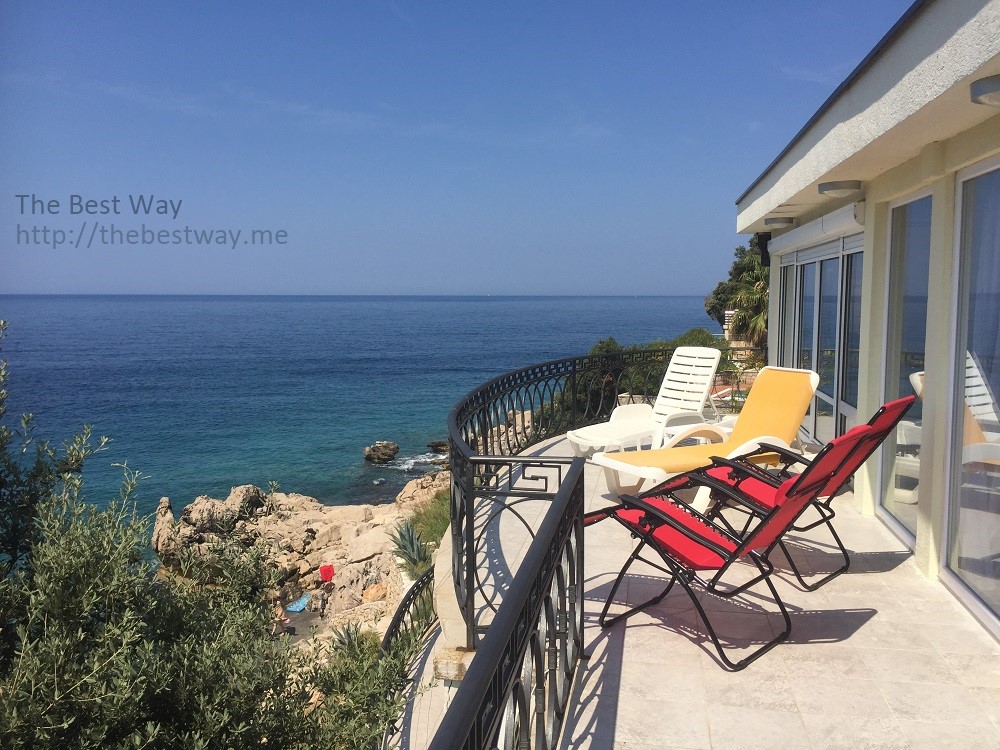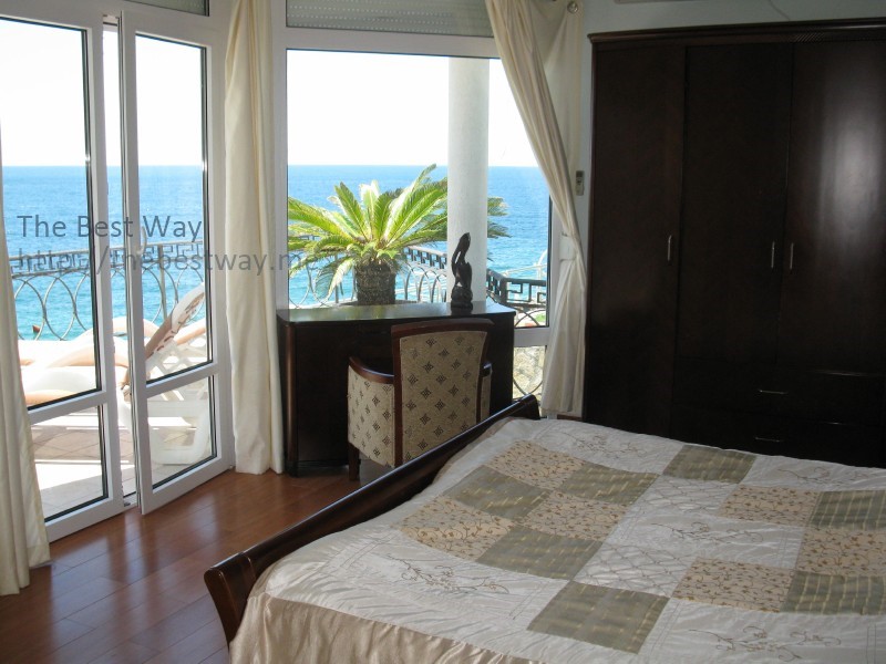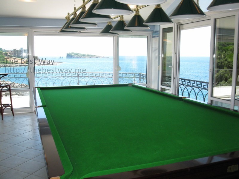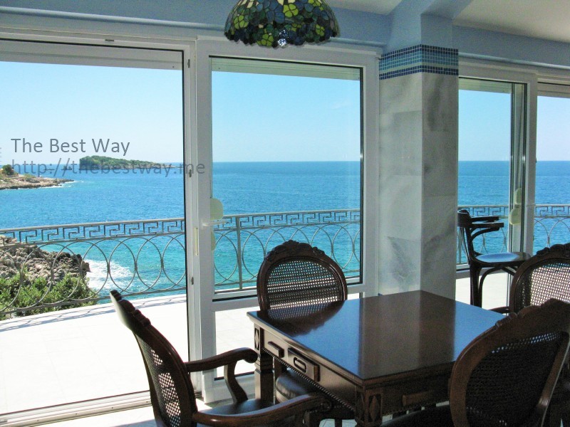 На самом берегу Адриатического моря в местечке Утеха в 8 км. от г. Бар построена вилла общей площадью 497 м2. Край террасы первого этажа находится в 10 метрах от воды и в 25 метрах от небольшого галечного пляжа, к которому ведет удобный спуск. Территория обнесена высокой каменной оградой с кованым обрамлением, что создает ощущение приватности и уюта в маленьком садике. Вилла состоит из двух частей - основного хозяйского здания, и части для работников (или гостей) с отдельным входом, где располагается однокомнатный апартамент со своей кухней, душевой, балконом и благоустроенной мансардой. Вход в большой дом начинается с широкой каменной лестницы, ведущей на крыльцо, обрамленное колоннами. Массивная двустворчатая входная дверь отделана деревом по металлической основе