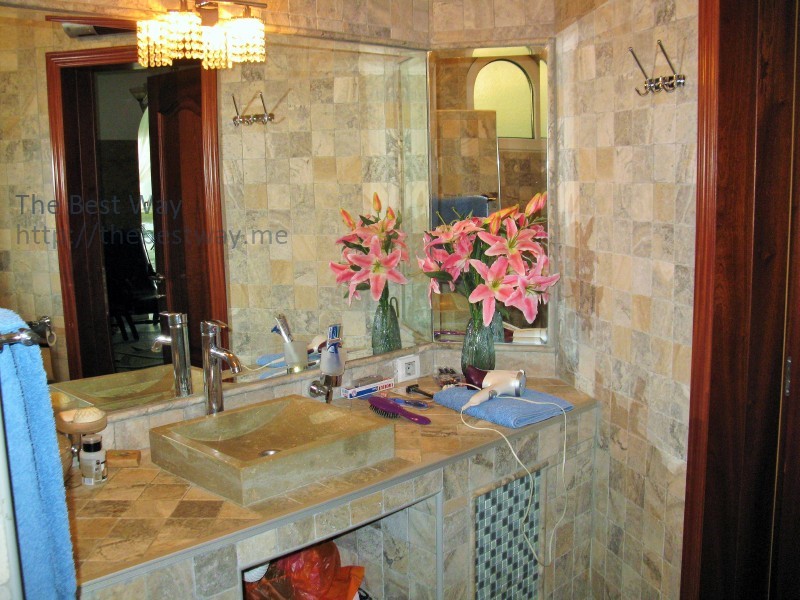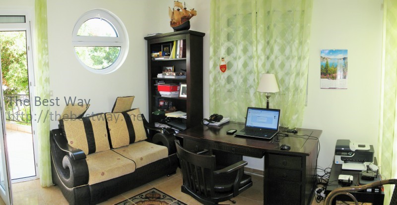 На второй этаж ведет полукруглая винтовая лестница. Здесь располагается хозяйская спальня с застекленной стеной и выходом на террасу над морем. У этой спальни персональный санузел, отделанный травертином (вид мрамора). Также из холла двери ведут во вторую спальню, кабинет и санузел с душевой. Все обставлено основательной итальянской мебелью, качественной и удобной. В кабинете стоит диван, который, в случае необходимости, можно разложить, и устроить спальное место. Если нет необходимости в обслуживающем персонале или охране, то можно объединить весь дом в один присоединив апартамент обслуги (охраны) по плоскости второго этажа. Тогда второй этаж будет состоять из трех спален, кабинета (еще спальни), двух террас и трех санузлов.