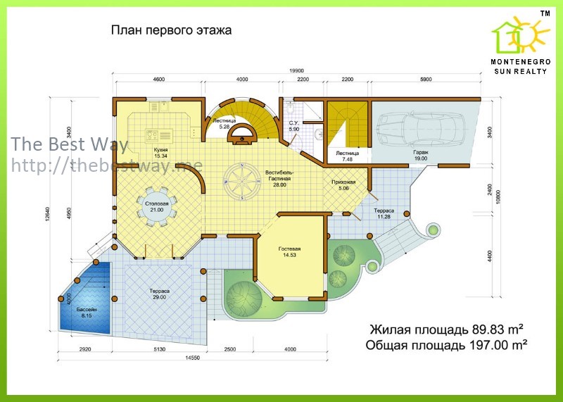 На первом этаже почти весь объем помещений воспринимается как единое целое и в то же время понятно функционально распределен. Это каминный зал с большим открытым камином, отделанным мрамором и гранитом, бело-зеленая столовая с овальным стеклянным столом, и большая кухня с островом, полностью оборудованная техникой для кулинарных упражнений. Белая столовая одной стеной (из стекла) полностью сообщается с террасой первого этажа, где стоит большой круглый стол, и где в теплое время зимой и все время летом, под шум прибоя, можно приятно провести время с друзьями и семьей. Там же, в уютном уголке, расположен мягкий диван. Почти вся терраса первого этажа прикрыта от солнца и дождя козырьком террасы второго этажа, опирающимся на белые колонны. Небольшой бассейн с пресной водой тут же, между колоннами. Подводная подсветка создает неповторимый эффект в вечернее время. На первом этаже так же есть телевизионная комната, с угловым диваном (спальня), и панорамными окнами от пола до потолка, с видом на море и садик. Рядом располагается гостевой санузел с душем.