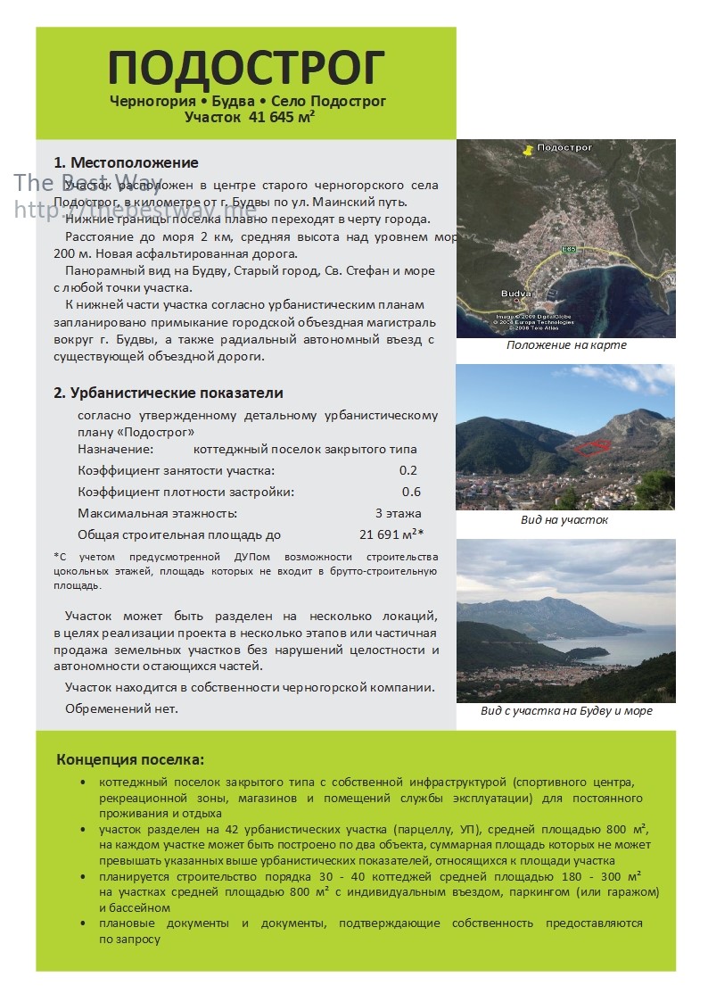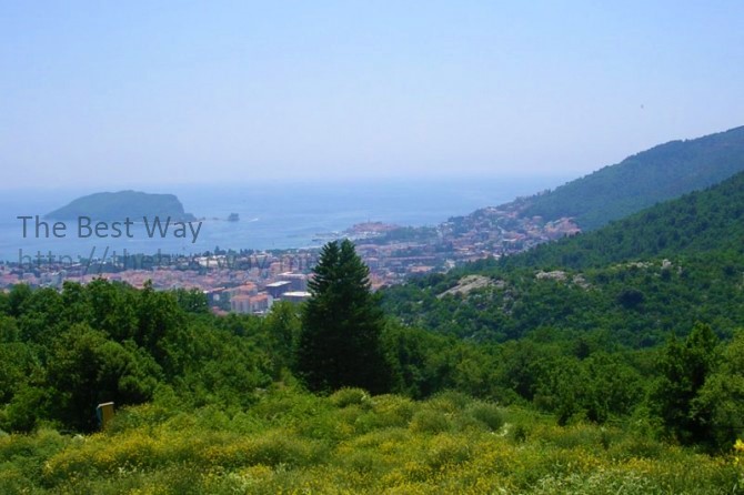 Местоположение Участок расположен в центре старого черногорского села Подострог, в километре от г. Будвы по ул. Маинский путь. Нижние границы поселка плавно переходят в черту города. Расстояние до моря 2 км, средняя высота над уровнем моря 200 м. Новая асфальтированная дорога. Панорамный вид на Будву, Старый город, Св. Стефан и море с любой точки участка. К нижней части участка согласно урбанистическим планам запланировано примыкание городской объездная магистраль вокруг г. Будвы, а также радиальный автономный въезд с существующей объездной дороги.