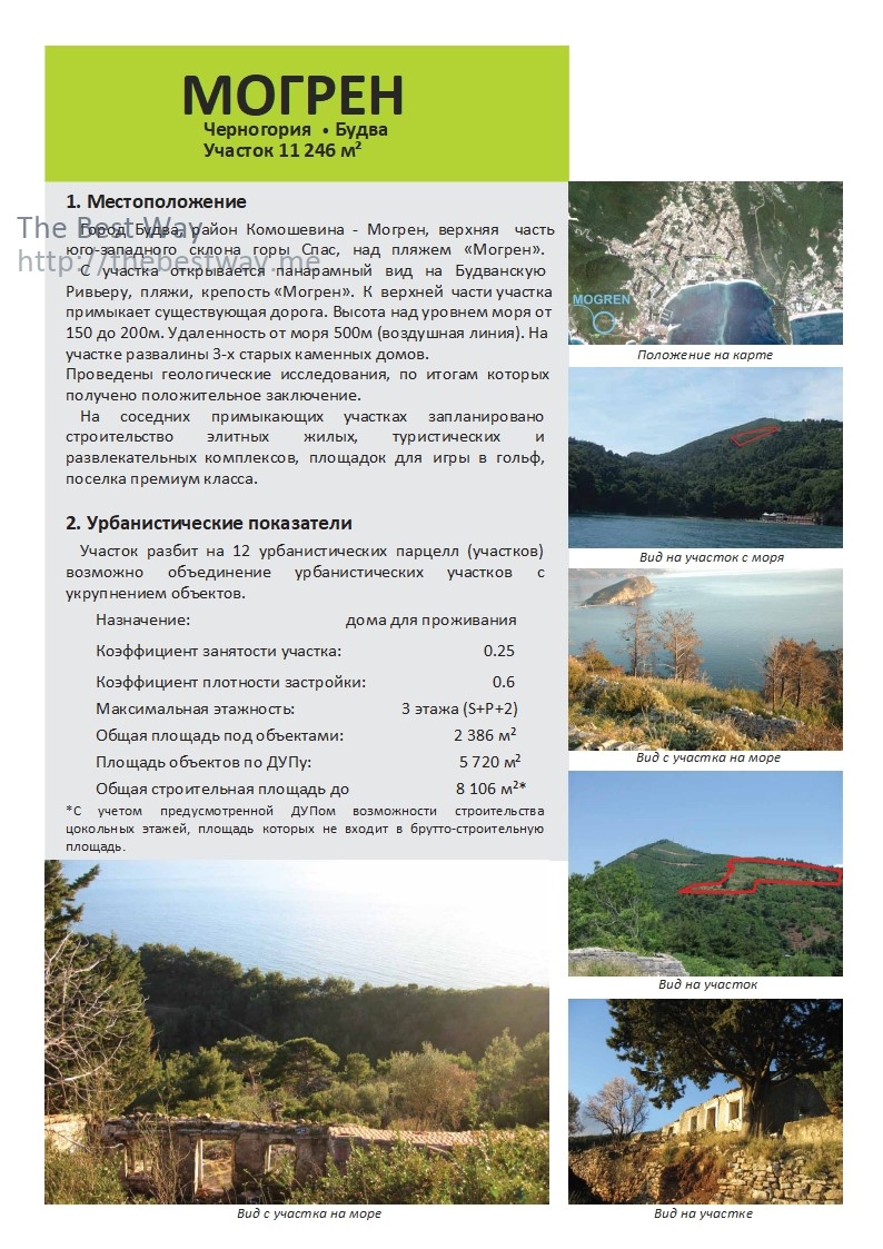 Местоположение Город Будва, район Комошевина - Могрен, верхняя часть юго-западного склона горы Спас, над пляжем «Могрен». С участка открывается панарамный вид на Будванскую Ривьеру, пляжи, крепость «Могрен». К верхней части участка примыкает существующая дорога. Высота над уровнем моря от 150 до 200м. Удаленность от моря 500м (воздушная линия). На участке развалины 3-х старых каменных домов. Проведены геологические исследования, по итогам которых получено положительное заключение. На соседних примыкающих участках запланировано строительство элитных жилых, туристических и развлекательных комплексов, площадок для игры в гольф, поселка премиум класса.
