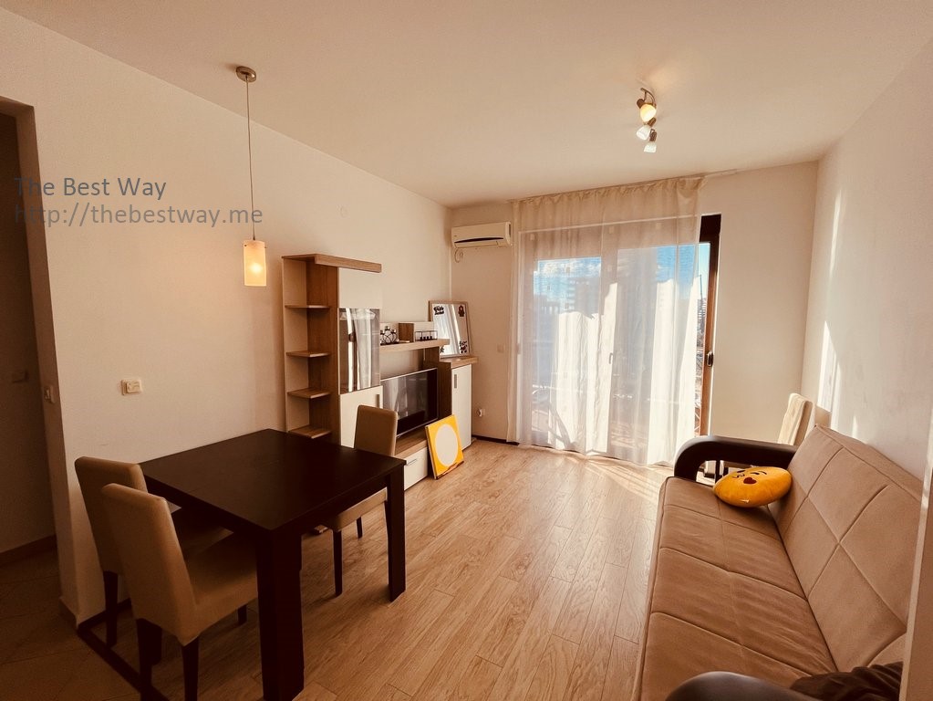Апартман са 1 спаваћом собом са терасом у срцу Будве на 6. спрату (укупно 6. спрат) са погледом на море. Само 150 од мора и плаже. Укупна површина стана је 41 м2. Нова кућа за изградњу 2013. године. Кућа је опремљена лифтом.