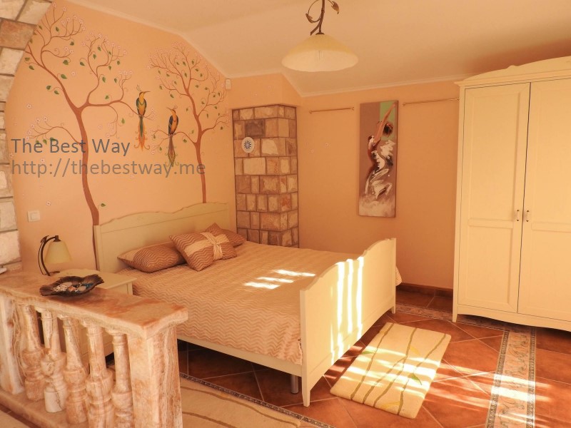 The house is located in Utjeha, 8 km from Bar. The house is in three floors, the ground floor is a separate studio apartment with kitchen and bathroom. On the first floor is a kitchen together with a living room with a fireplace, an office and a dressing room, a living room adjoins a large comfortable terrace. On the second floor is a large bedroom with access to the terrace, which offers wonderful views of the sea, separate shower room and toilet. The house is fully furnished, equipped with air conditioning. Quality sanitary ware, natural stone finish.