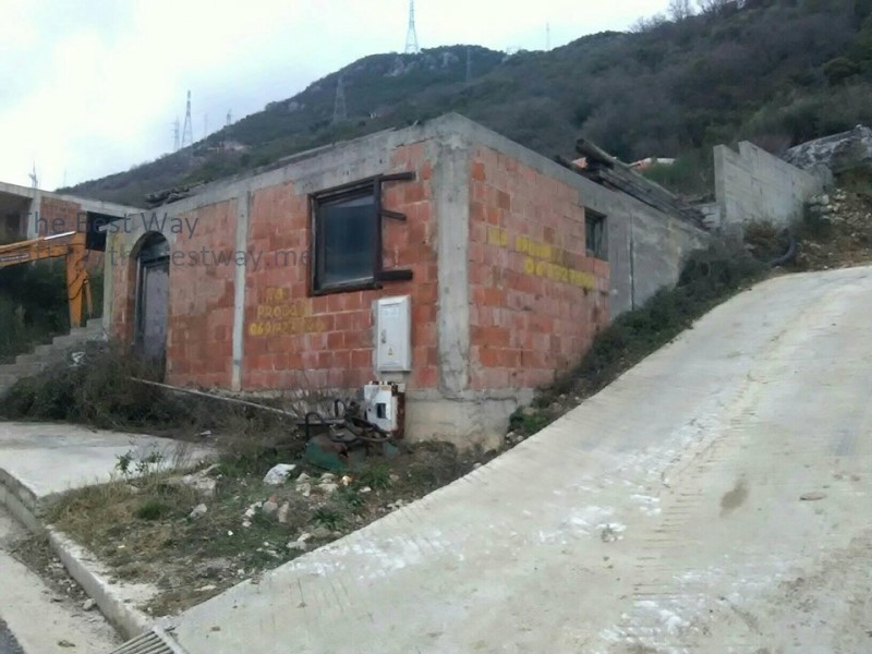 Land for sale with an unfinished house, land 450 m2 along the old Kotor road (Kotor), with a magnificent view of Lastva Grbaljska and the Jaz beach, with an individual project of a wooden house of 103 m2, with a terrace of 28m2, and plus a stone first level of 28 m2.