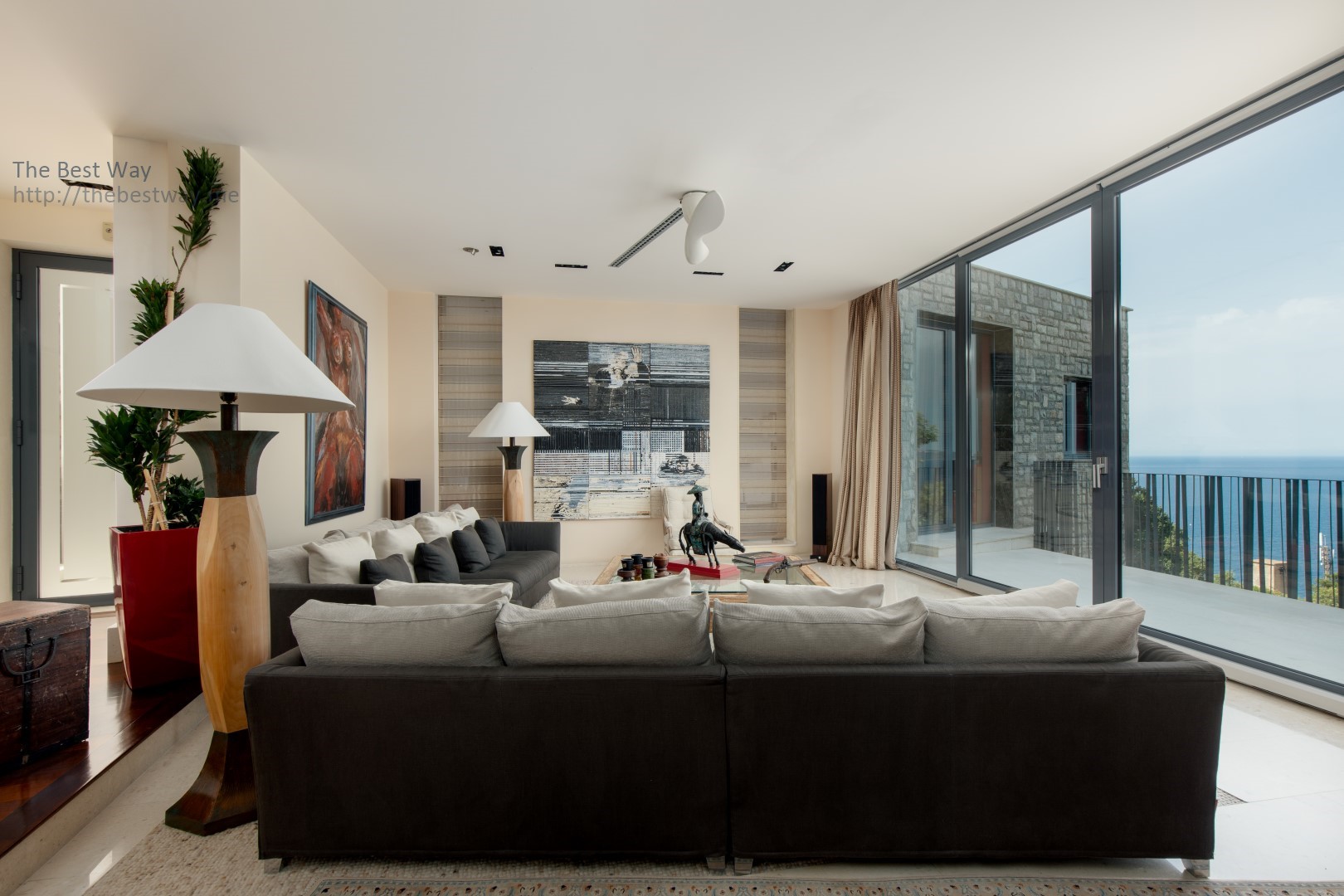 On the ground floor, the residence consists of a large bright reception room with high windows overlooking terraces, patios and sea views, a TV room, a large dining room, a modern fully equipped kitchen made by Bulthaup with semi-professional Gaggenau equipment (equipped kitchen with pantry and laundry) and a separate daily dining room with access to a large covered terrace on the embankment. Outside terraces expand these spaces towards the garden and are a huge advantage of the house.