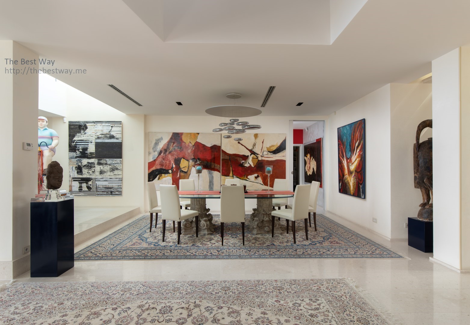 На первом этаже резиденция состоит из большой светлой приемной с высокими окнами, выходящими на террасы, патио и видом на море, телевизионной комнаты, большой столовой, современной полностью оборудованной кухни производства Bulthaup с полупрофессиональным оборудованием Gaggenau (оборудованная кухня с кладовой и прачечной) и отдельная ежедневная столовая с выходом на большую крытую террасу на набережной. Снаружи террасы расширяют эти пространства в сторону сада и являются огромным преимуществом дома.