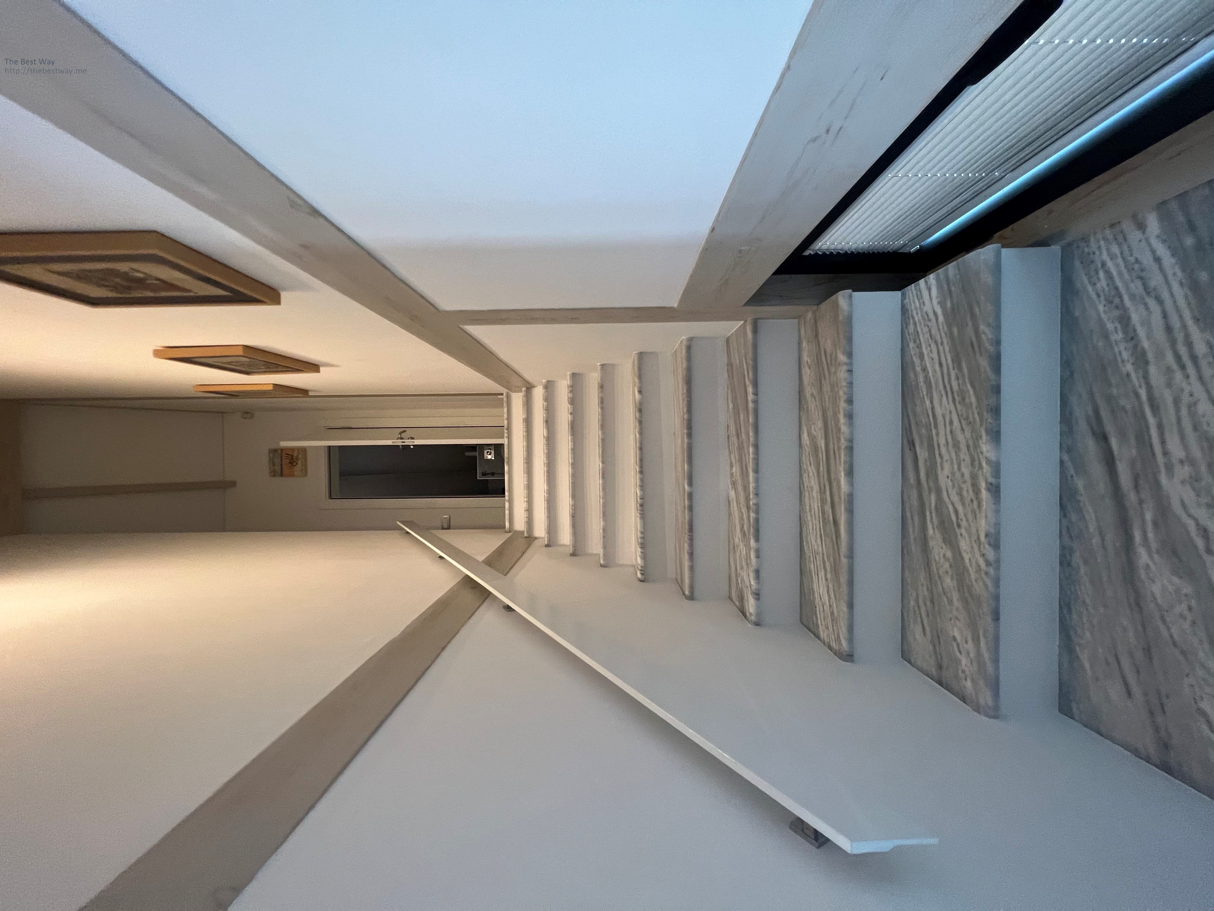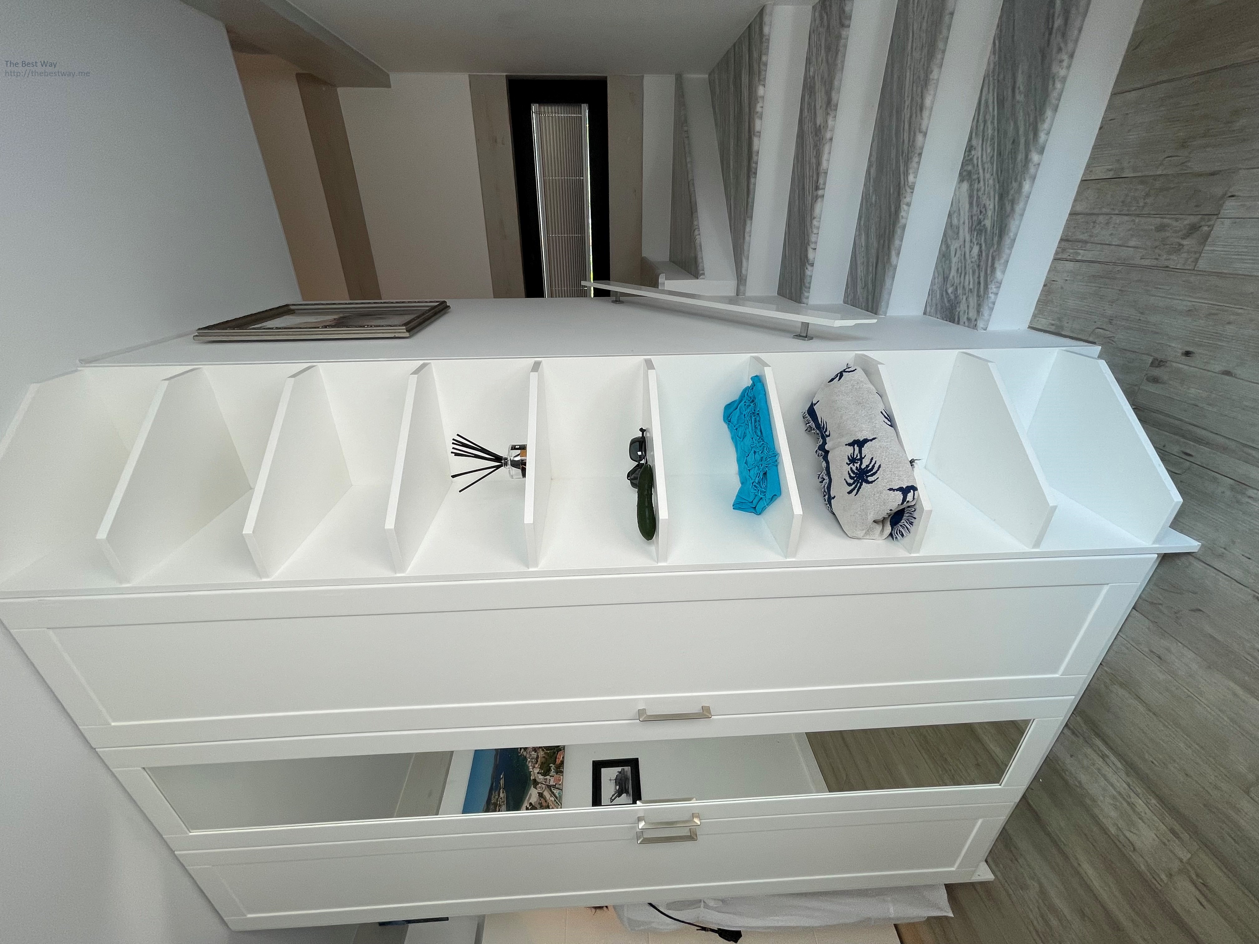 На первом этаже дома находятся кухня и столовая зона, гостиная, помещение под спальню, которое может быть переоборудовано в кабинет или тренажерный зал, санузел с душевой кабиной и системы хранения для вещей. На второй этаж дома ведет лестница из натурального мрамора, где располагаются две спальни с панорамными окнами, видом на горы и тиватский залив. В обоих спальнях смонтированы вместительные системы хранения для белья, одежды и книг — ваши вещи всегда будут в порядке, а в доме еще больший визуальный простор и чистота.
