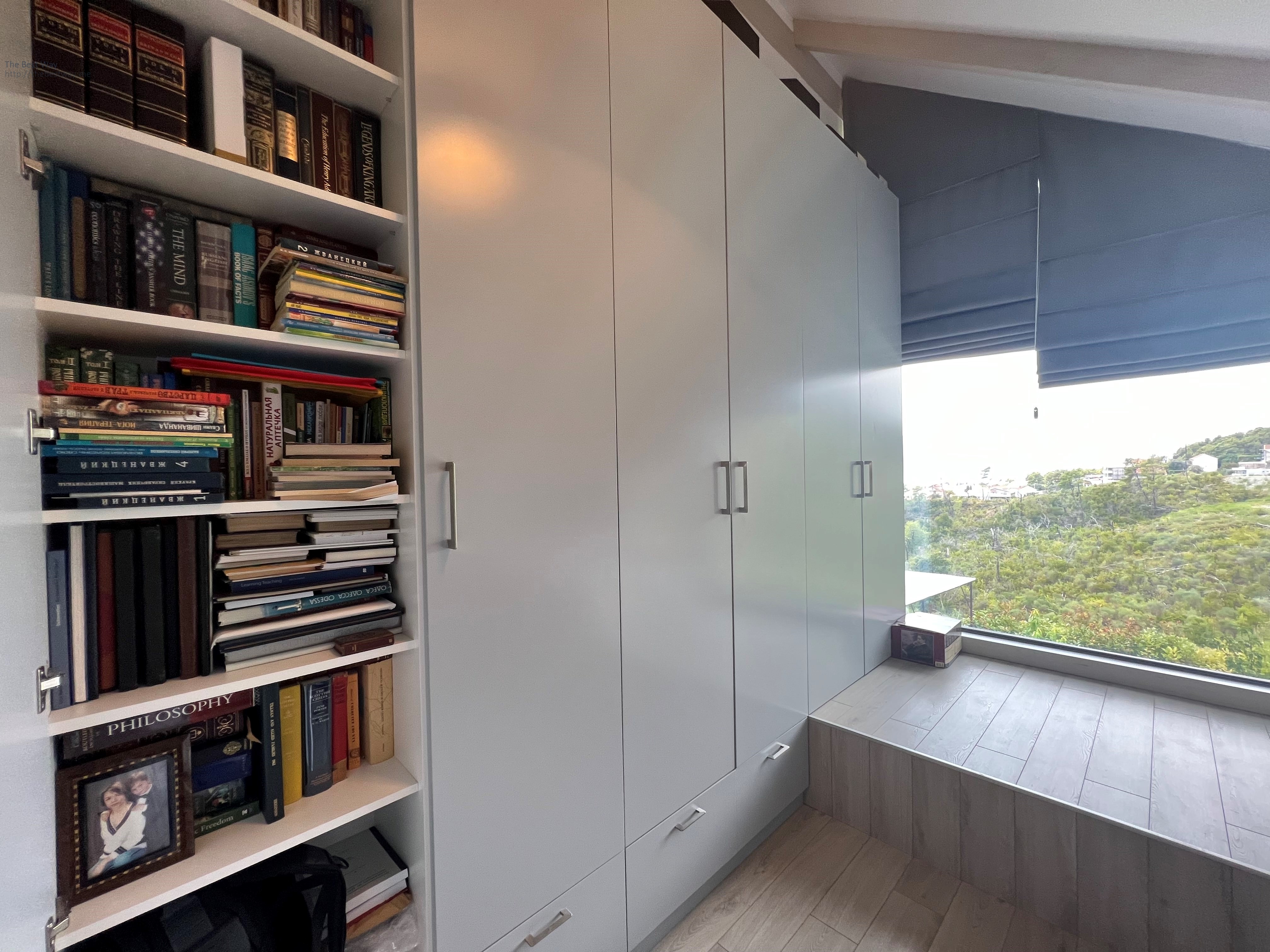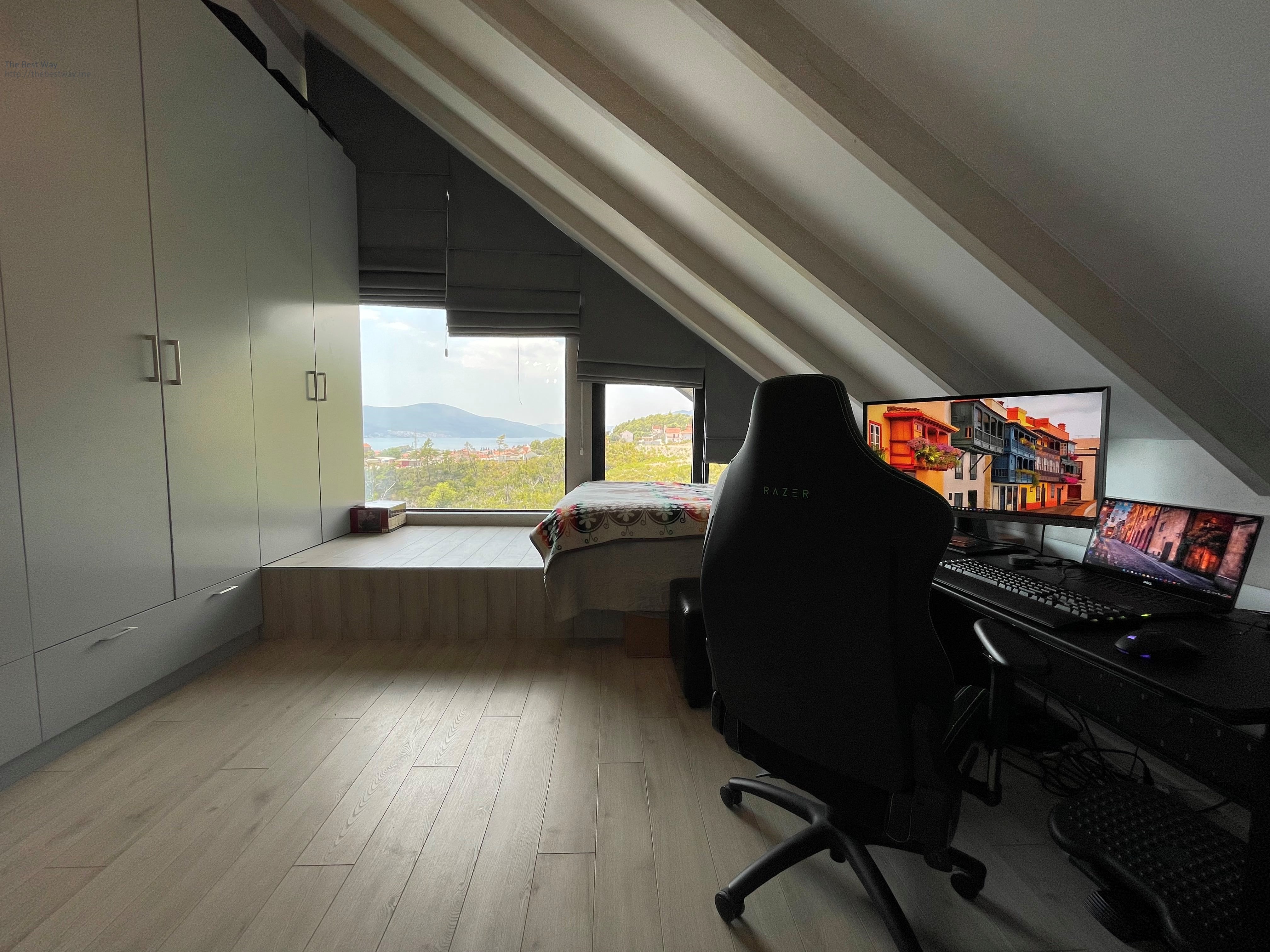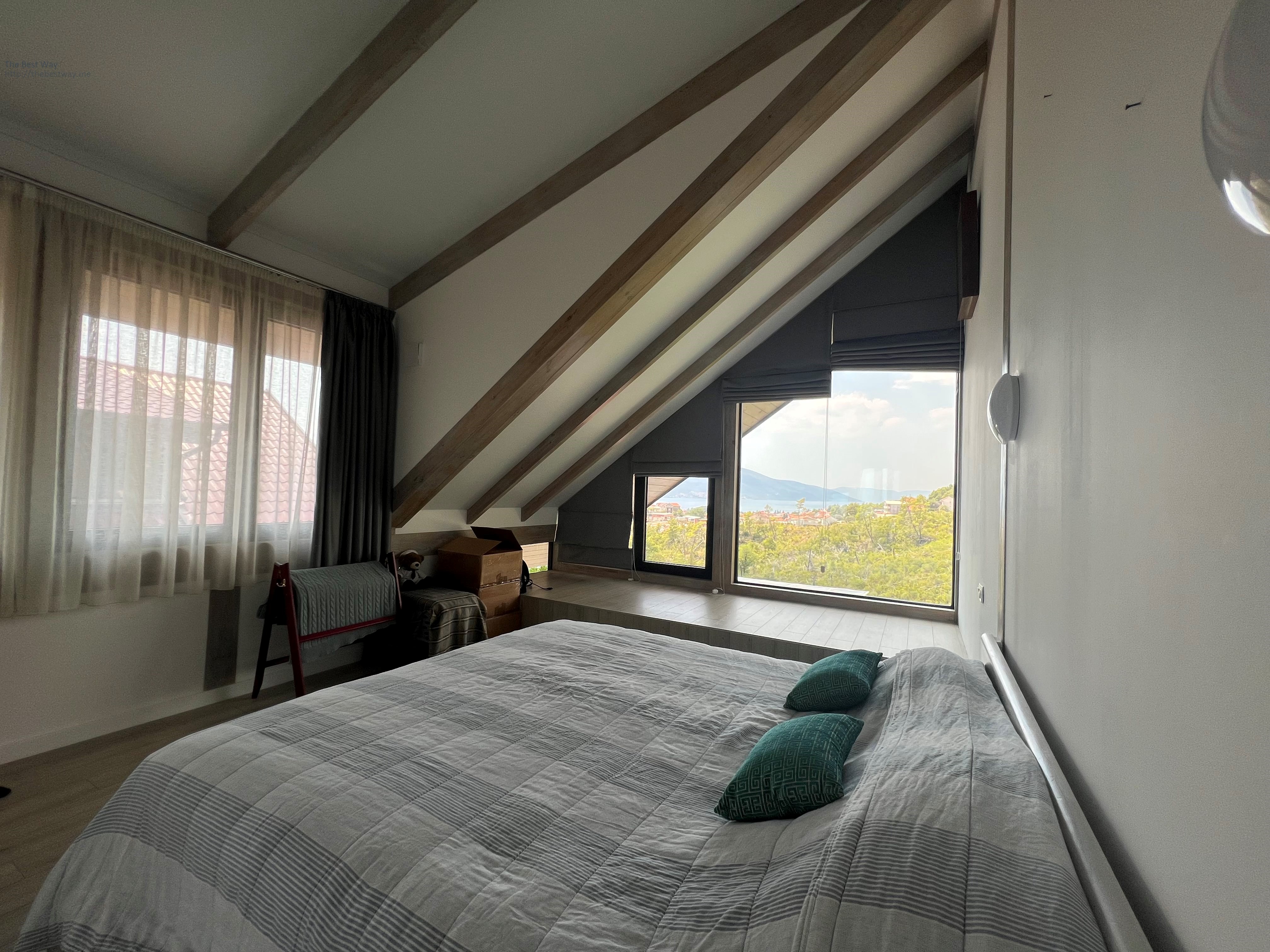 On the first floor of the house there is a kitchen and dining area, living room, bedroom room, which can be converted into an office or fitness room, bathroom with shower and storage systems for things. Natural marble staircase leads to the second floor of the house, where there are two bedrooms with panoramic windows, overlooking the mountains and Tivat Bay. In both bedrooms there are roomy storage systems for linen, clothes and books — your belongings will always be in order and the house will be even more visual space and cleanliness.