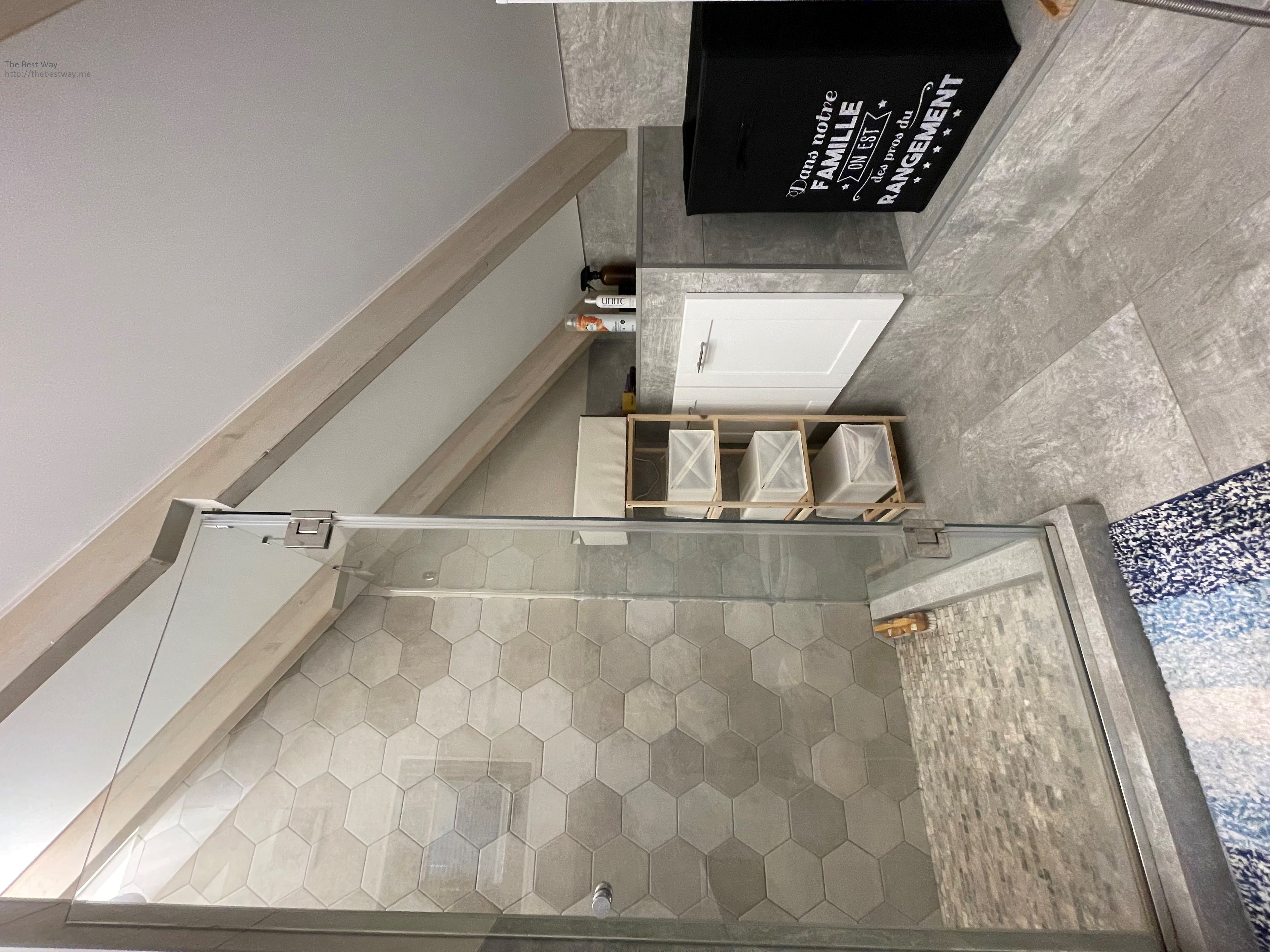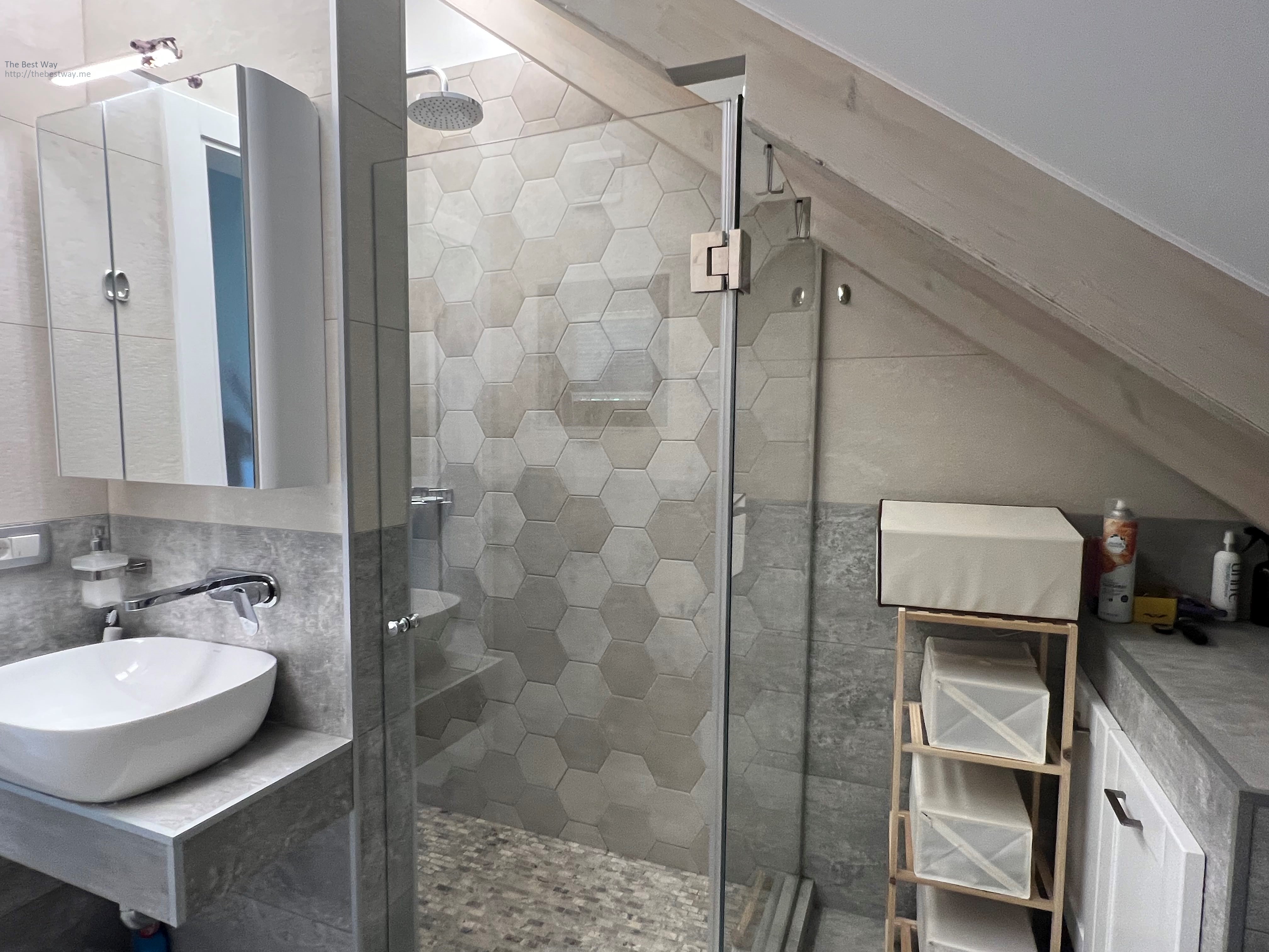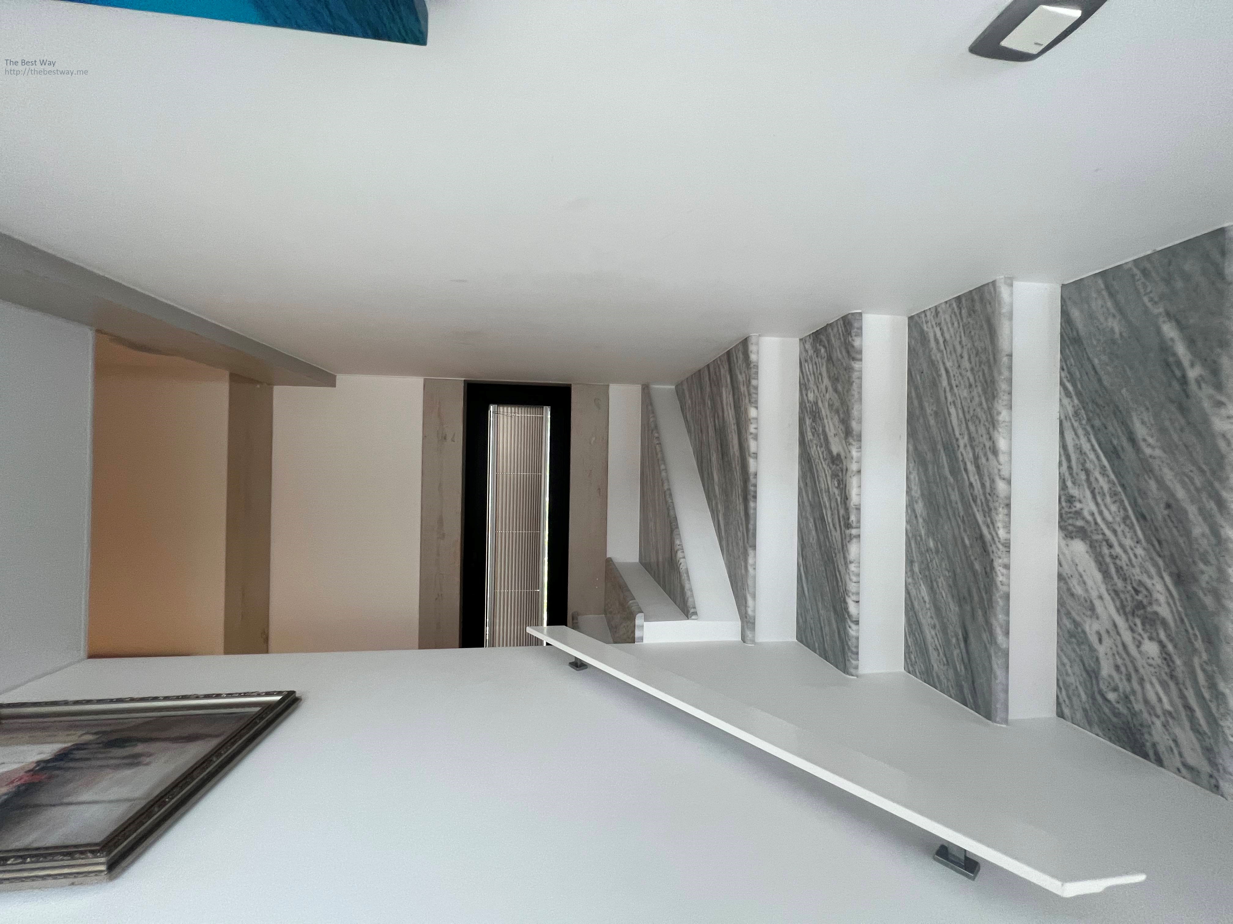 On the first floor of the house there is a kitchen and dining area, living room, bedroom room, which can be converted into an office or fitness room, bathroom with shower and storage systems for things. Natural marble staircase leads to the second floor of the house, where there are two bedrooms with panoramic windows, overlooking the mountains and Tivat Bay. In both bedrooms there are roomy storage systems for linen, clothes and books — your belongings will always be in order and the house will be even more visual space and cleanliness.