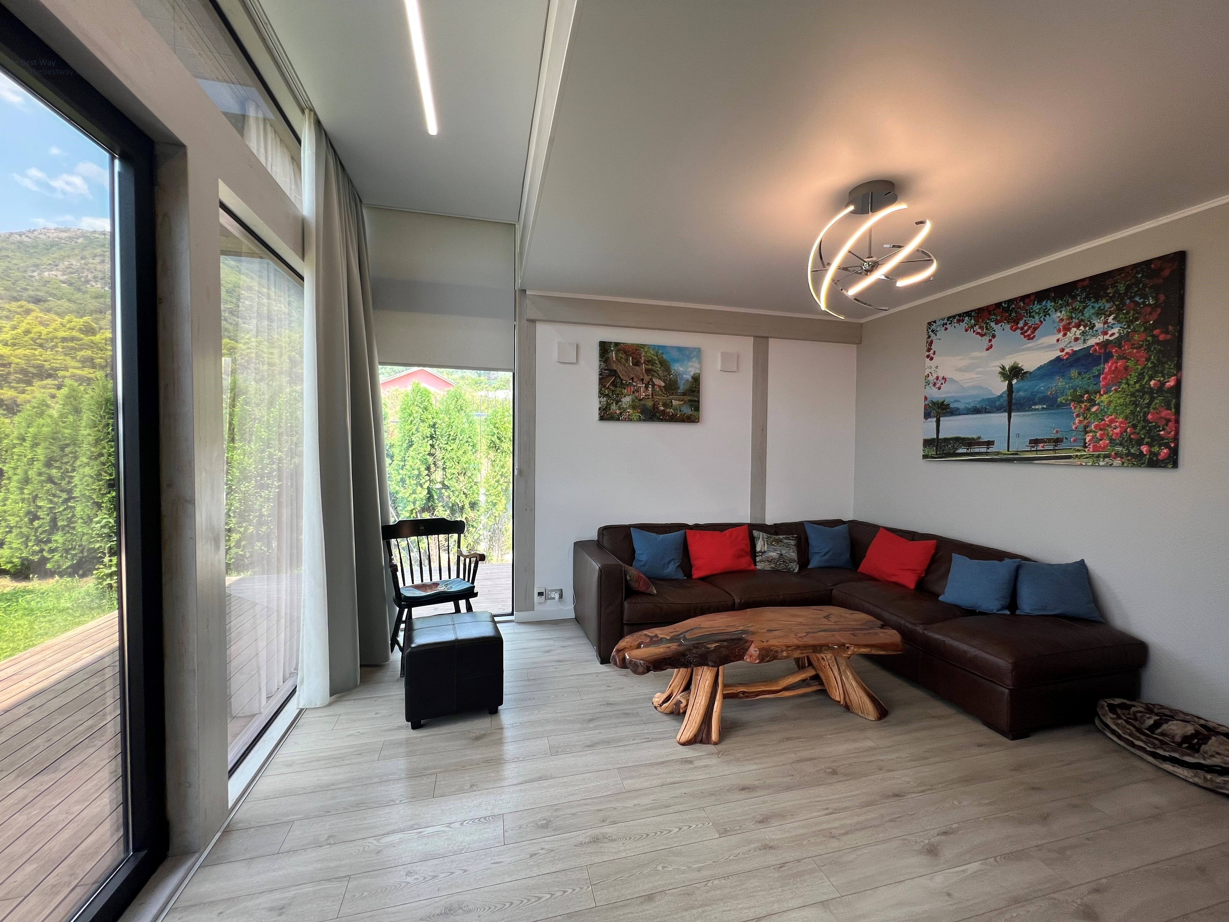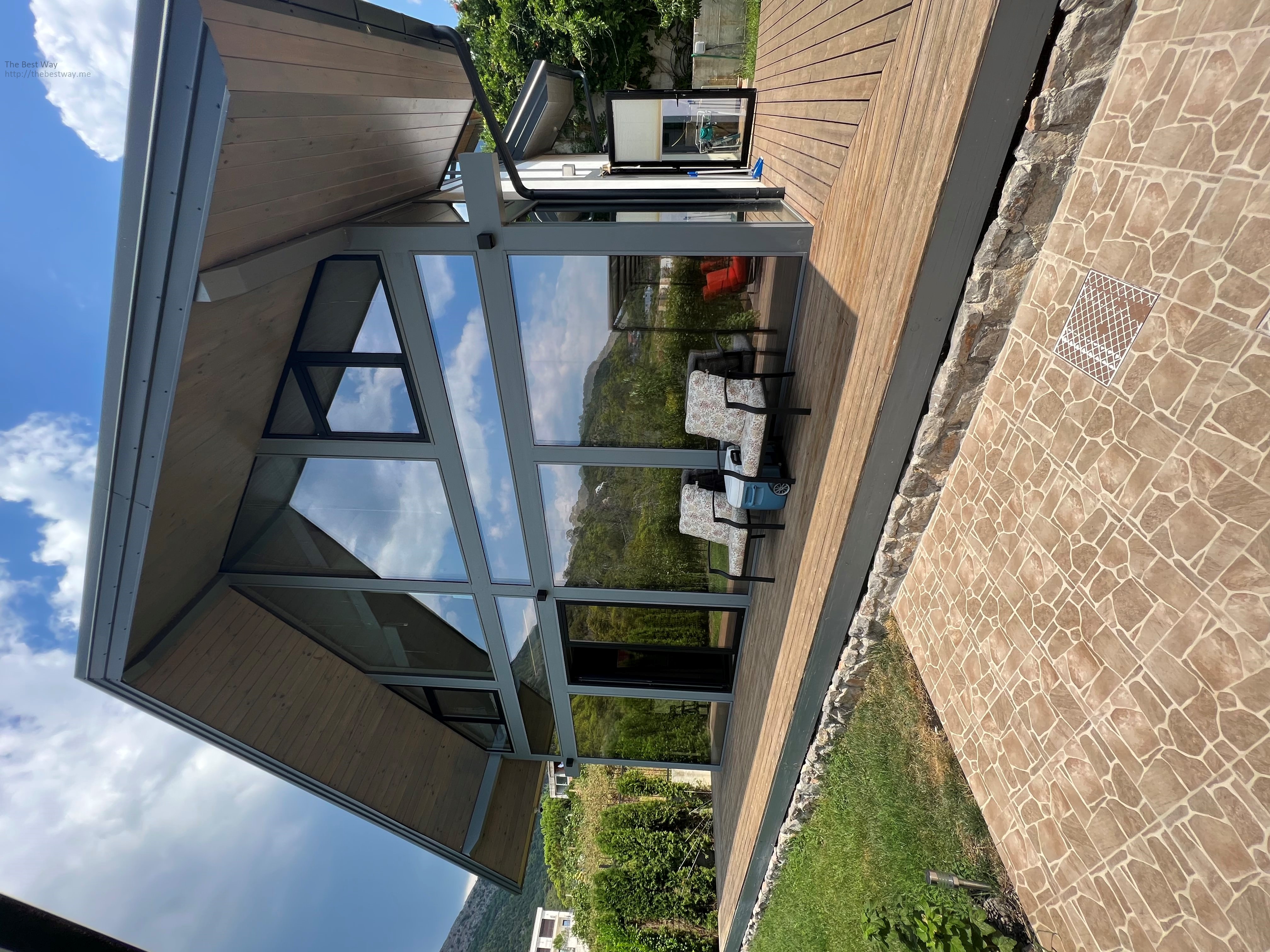 When building and finishing used high quality environmentally friendly materials. The front wall of the house is completely made of glass with a protective coating that keeps the inside of the house cool and protected from the sun, and the house has a panoramic view of all rooms of the Tivat Bay, the mountains and stunning sunsets.